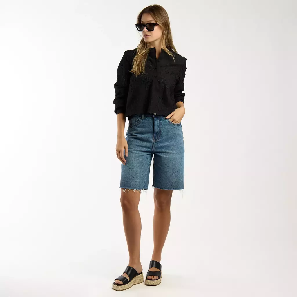 Camisola manga larga de cuello mao, confeccionada en broderie de algodón con detalle de pétalos bordados en relieve. Acceso de prenda con botones forrados en delantero. Posee mangas globo, detalle de cuello y puños en poplín. Largo modular a primera cadera, de calce clásico.