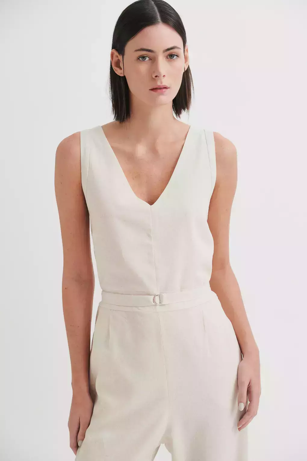 El Mono Fei está confeccionado en lino liviano y fresco, ideal para la temporada de verano. Su diseño incluye un escote en V delantero y trasero, cintura ajustable con lazo fino con hebilla metálica y pierna ancha, que aporta movimiento y elegancia. Versátil y sofisticado, es una prenda perfecta tanto para el día como para la noche, ya sea con sandalias planas para un look relajado o con tacos para una ocasión especial.