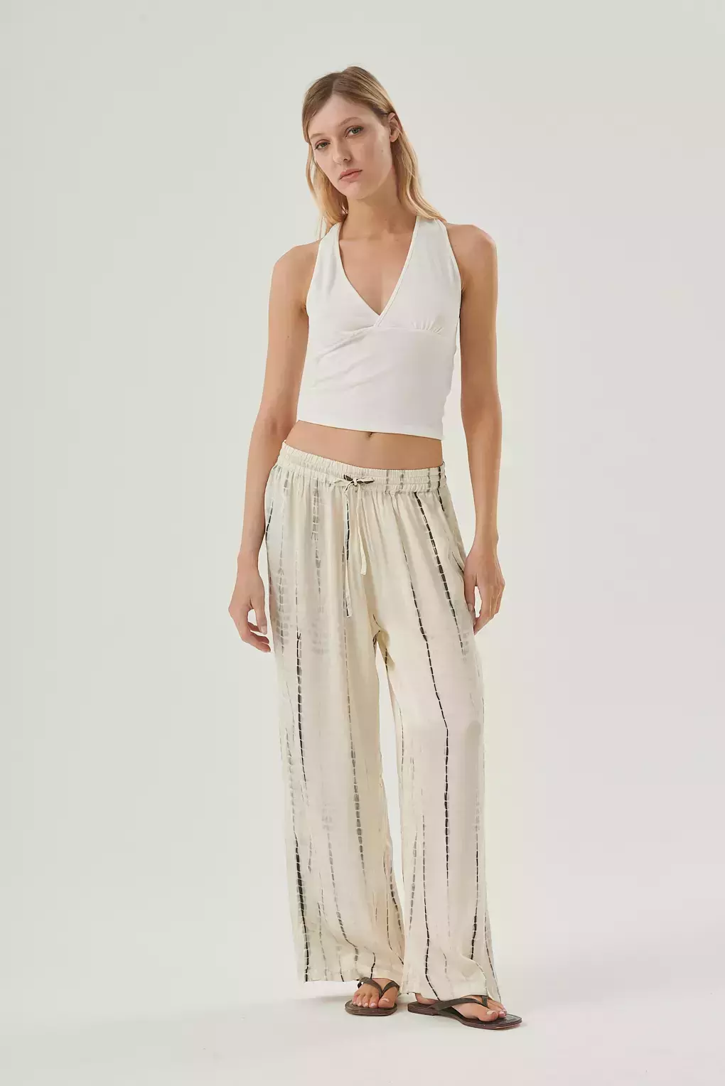 El Pantalón Zuna Print es esa prenda que combina comodidad absoluta con un estilo sofisticado y moderno. Confeccionado en modal satinado, ofrece un tacto suave y una caída fluida que estiliza la silueta. Su estampa de líneas verticales alarga visualmente las piernas, logrando un efecto favorecedor que se adapta a todo tipo de cuerpos. La cintura elastizada con lazo ajustable asegura un calce perfecto y práctico para el día a día.