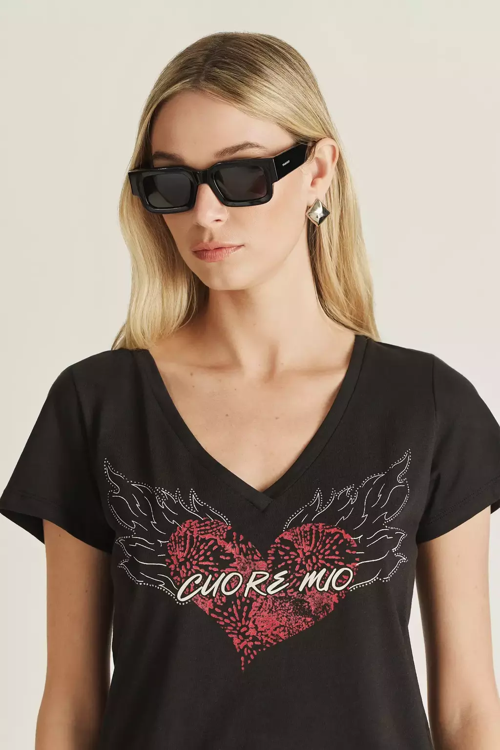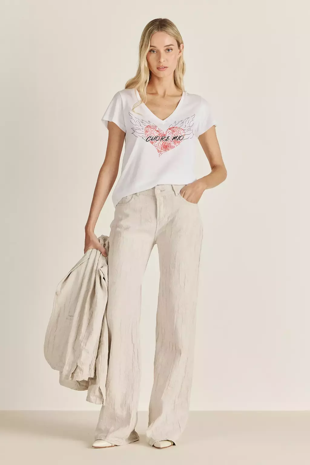 Remera escotada confeccionada en Pima 100% algodón. Lleva diseño de estampa con glitter.