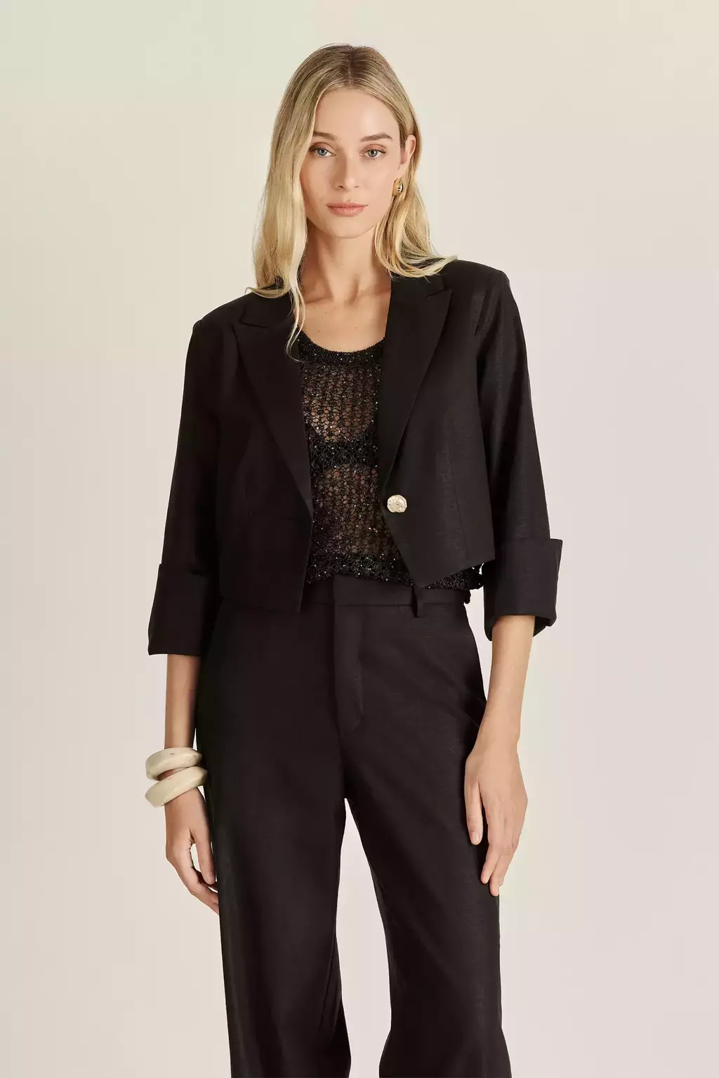 Confeccionado en lino liviano, su calce crop y relajado lo hace ideal para los días cálidos. Lleva un botón metálico, diseño exclusivo de la colección de Verano 26.