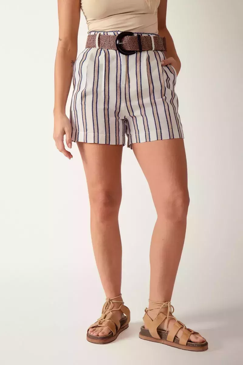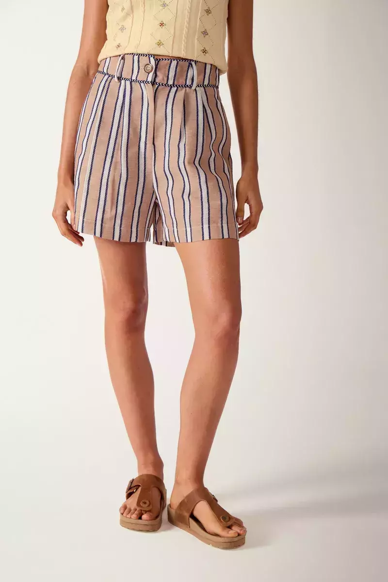 Short rayado con cinturón de yute ajustable en cintura. Detalle de galón trenzado en cintura. Bolsillos en laterales.