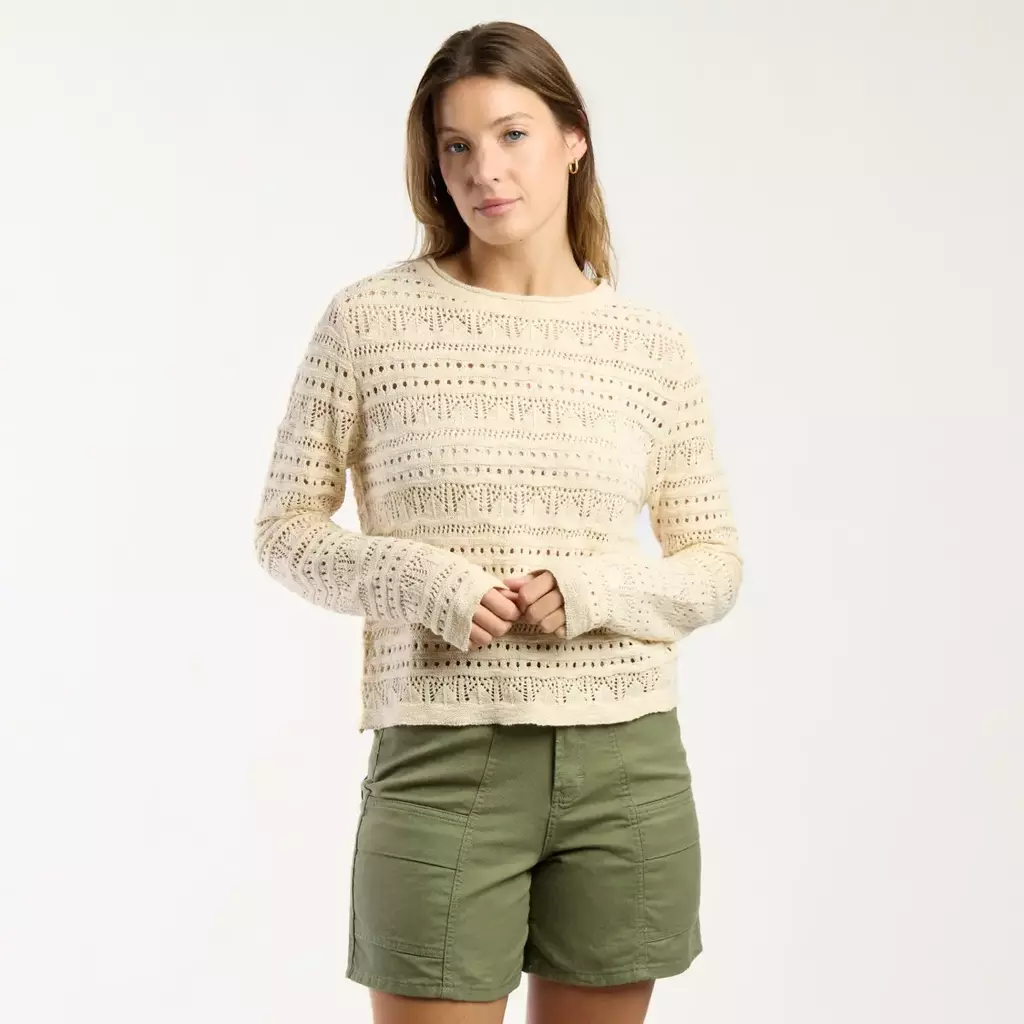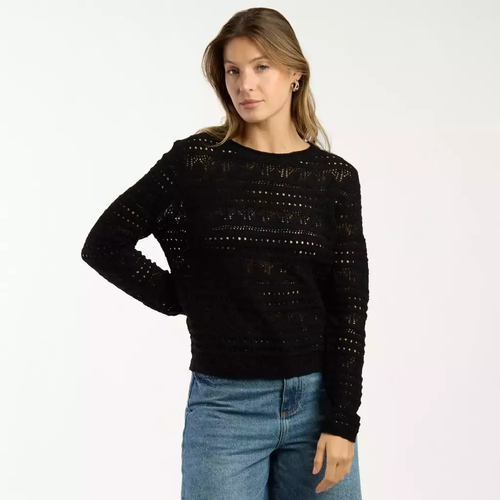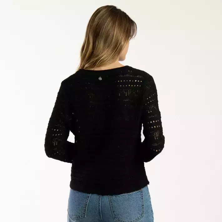 Sweater liviano de tejido calado, con cuello redondo y largo modular hasta la primera cadera.  Su diseño fresco lo convierte en la prenda ideal para los días de verano, ya sea para usar sobre una musculosa o como complemento en looks relajados.