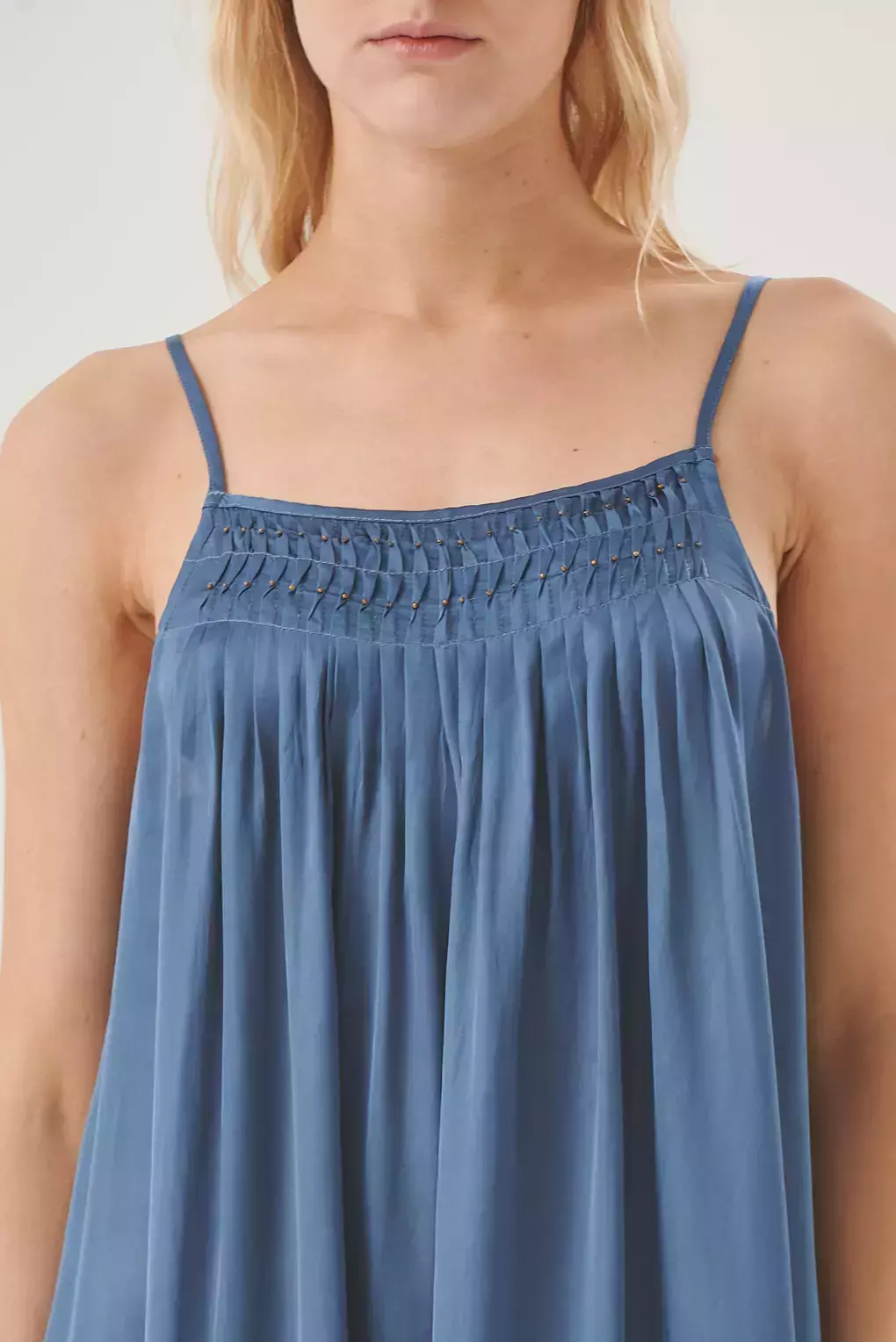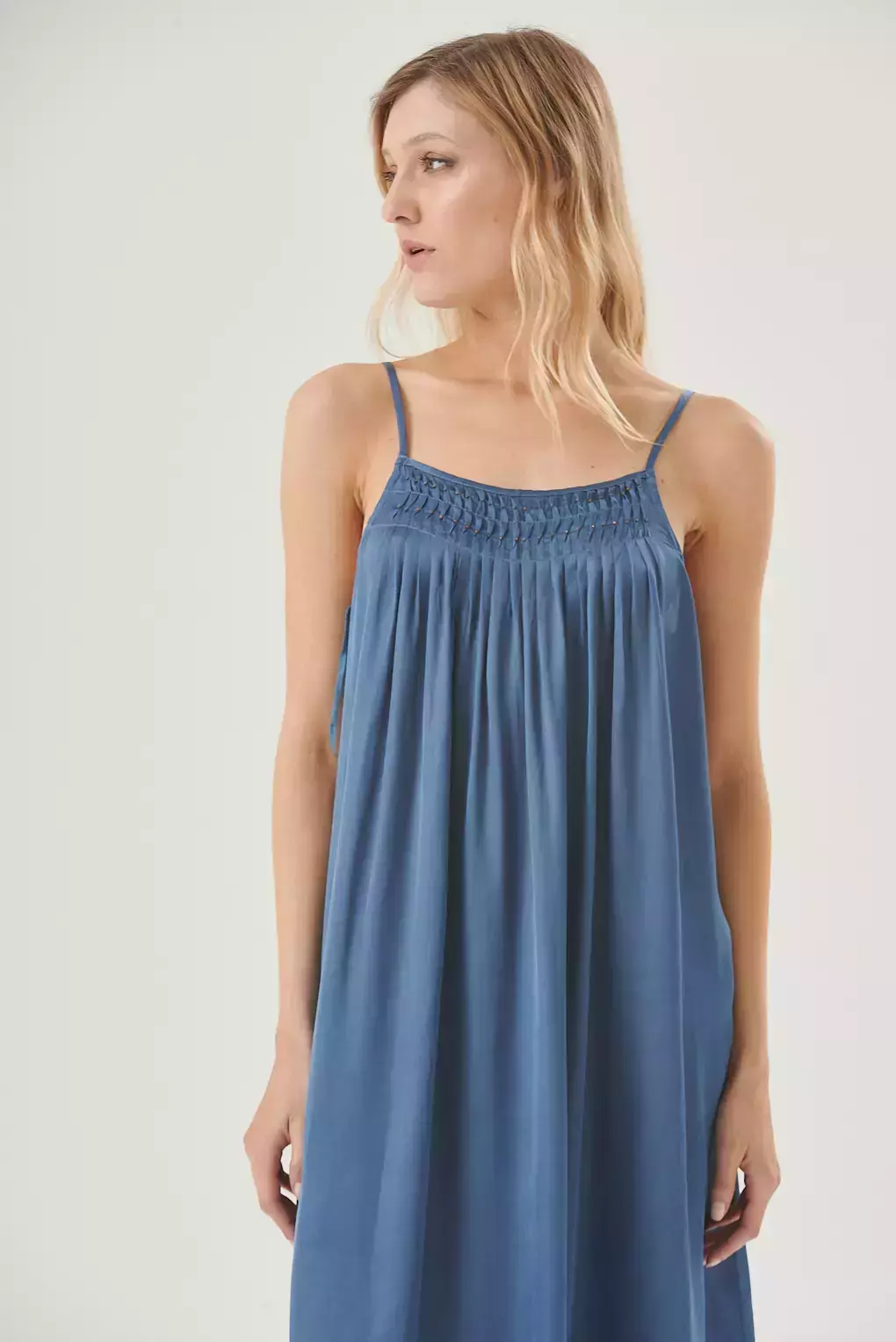 Confeccionado en modal satinado, tiene un brillo sutil y una caída suave que acompaña cada movimiento con ligereza. Tiene un diseño largo y relajado, ideal para quienes buscan comodidad sin renunciar al estilo. El detalle de frunces en el escote con pequeños apliques y los breteles finos realzan el aire femenino, mientras que la espalda descubierta suma sensualidad sin excesos.