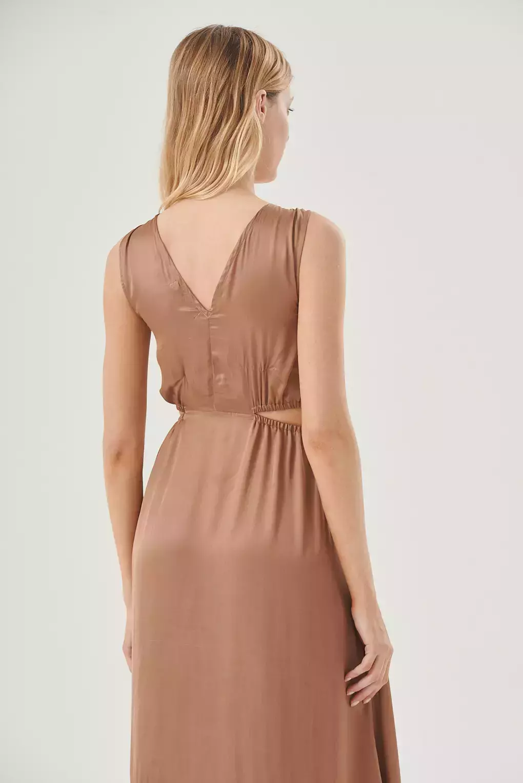 El Vestido Ruby es ese vestido pensado para robarse todas las miradas. Confeccionado en tela satinada de caída fluida, acompaña cada movimiento con un brillo sutil y sofisticado. Su escote en V profundo se realza con delicados apliques metálicos, mientras que el cut out frontal con argolla aporta un toque moderno. La espalda descubierta y la falda amplia lo convierten en una prenda fresca, femenina y elegante.